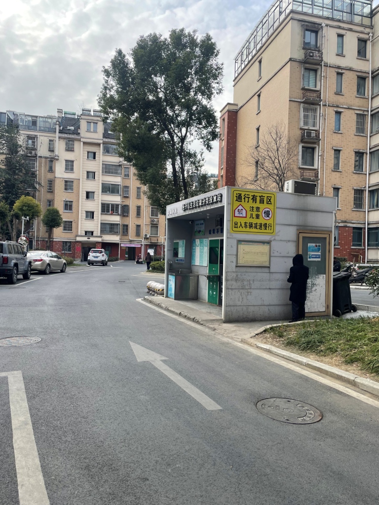 记者看到,垃圾房的墙上张贴着显眼的提醒标志:“通行有盲区,注意儿童,出入车辆减速慢行。”
