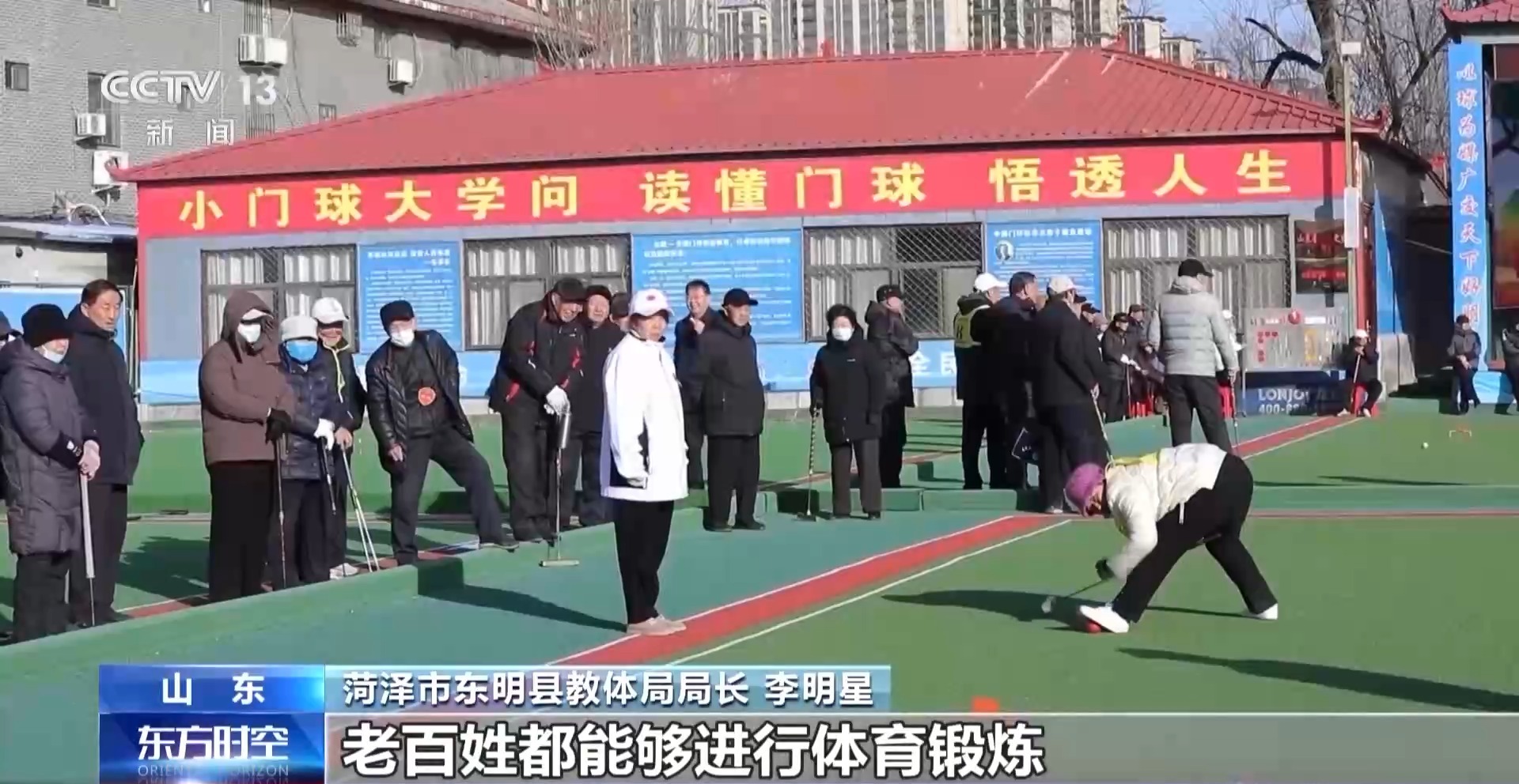 菏泽市东明县教体局局长 李明星:17片连在一起的标准化门球场,其中8片有雨棚,下雨天、刮风天,老百姓都能够进行体育锻炼。