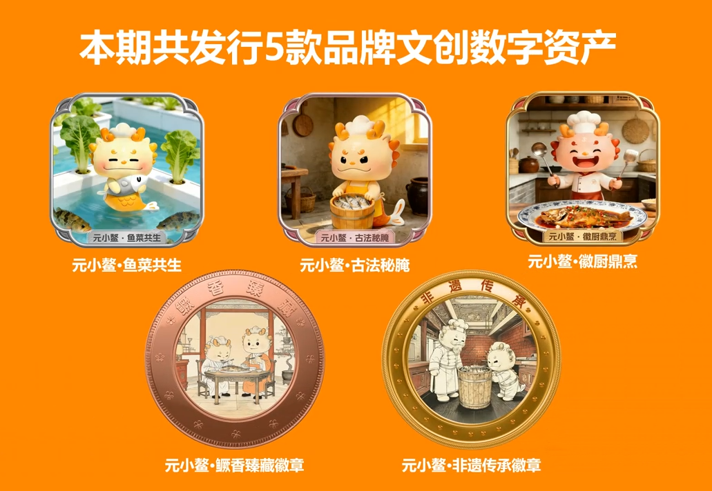 发布现场,吴永学宣布“元小鳌”全球首款非遗数字臭鳜鱼正式启航。这款数字臭鳜鱼由皖新传媒携手安徽左岸数字科技有限公司(简称“左岸数科”推出。发布会现场,5款集徽派美学意境与现代科技质感于一体的“元小鳌”数字IP形象惊艳亮相。消费者在购买徽三实体非遗臭鳜鱼的同时,即可获赠对应的数字资产。这些数字藏品承载了徽州臭鳜鱼独家技艺解析、限量食谱等珍贵文化权益,并支持在合规框架内进行收藏与权益兑换。“数实融销”的新方式,让传统臭鳜鱼产品融合数字IP面向更多年轻消费群体提供潮玩体验。
