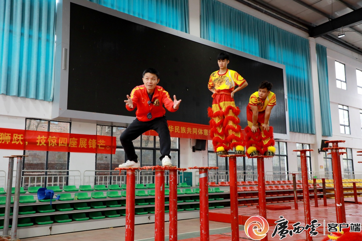 梧州市藤县中等专业学校狮舞训练基地内,国家非遗(藤县狮舞)区级代表性传承人祝盛清指导弟子们进行高桩表演训练。岳柱健 摄