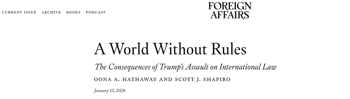 文章写道:“过去一年间,特朗普政府不断攻击并瓦解现有国际秩序的法律基础架构。它制裁国际刑事法院的法官和律师,阻挠其对罪行的追诉;它竖起贸易壁垒,违反世界贸易组织协议,背弃曾为全球稳定提供保障的自由贸易准则;它拖欠联合国会费,退出或违反无数条约。更公然威胁主权国家与地区,其手段并非联合国安理会授权的合法措施,而是非法的单边武力与胁迫。”