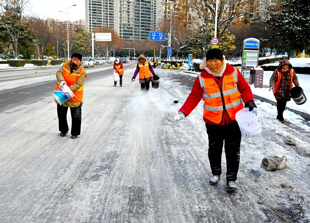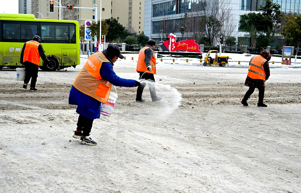 受冷空气影响,气温持续走低,积雪结冰路面给人们出行带来了诸多不便。连日来,在亳州市区街头,处处可见环卫工人撒盐除冰的身影,身穿橙色服装的环卫工人亦成为雪中的一抹亮色。