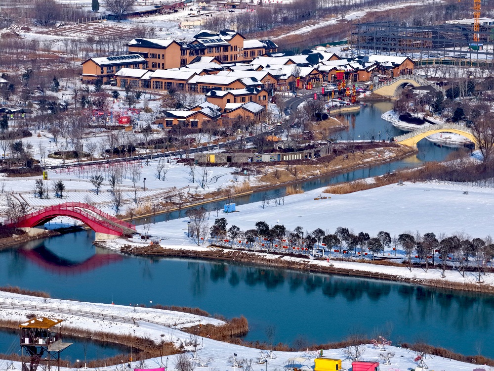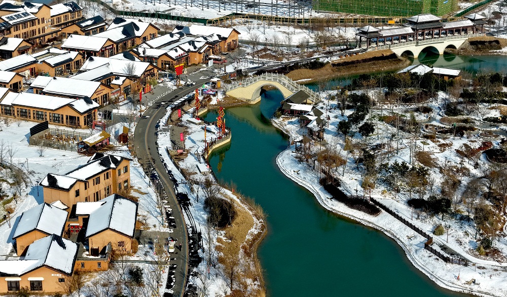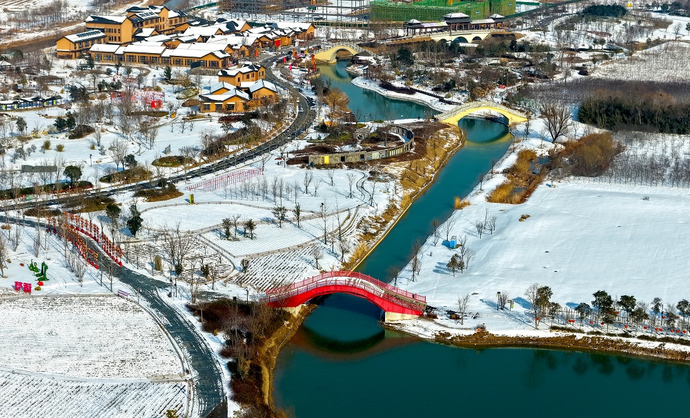 一场冬雪过后,白雪覆盖下的亳州市华佗百草园银装素裹,美景如画。