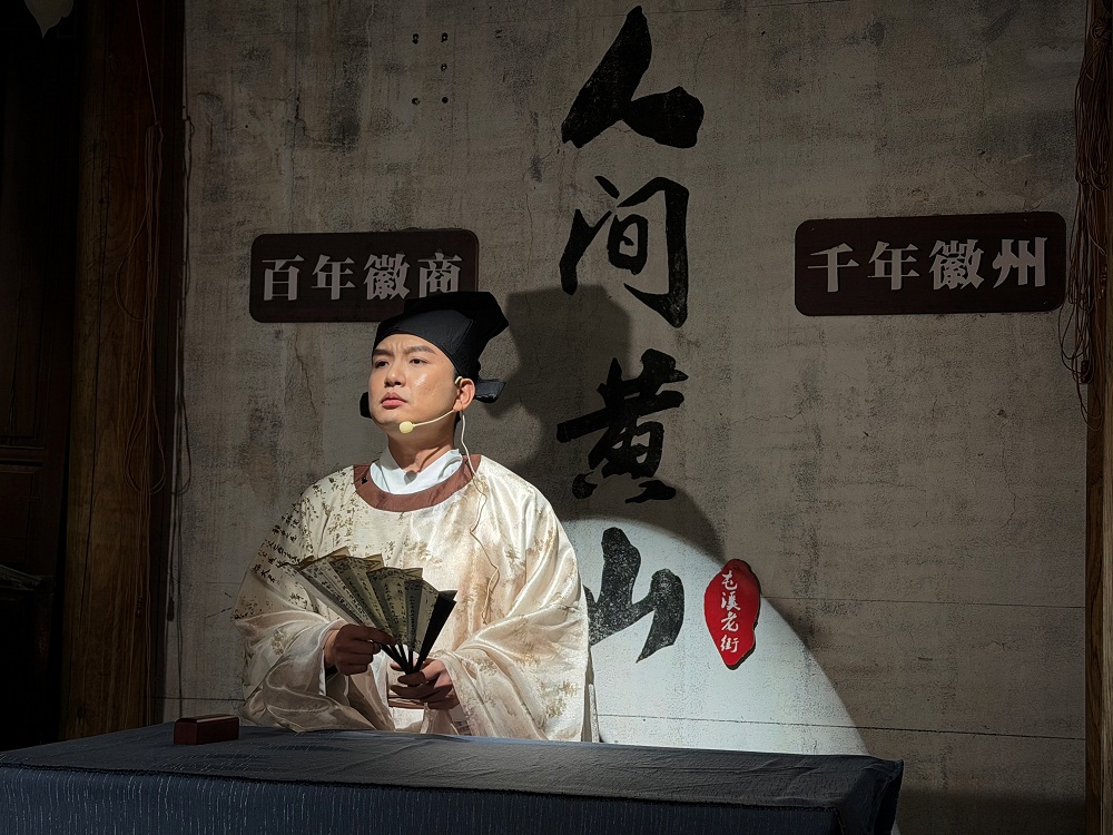 沿着屯溪老街一路走去,你会看到这样的场景,由工作人员渔夫、说书先生、打更人、卖货郎等极具徽州特色的角色散落在街区各处,以趣味游戏等方式与游客互动,让他们在体验中收获情感共鸣与游玩乐趣,沉浸式感受老街的历史底蕴与烟火气息。