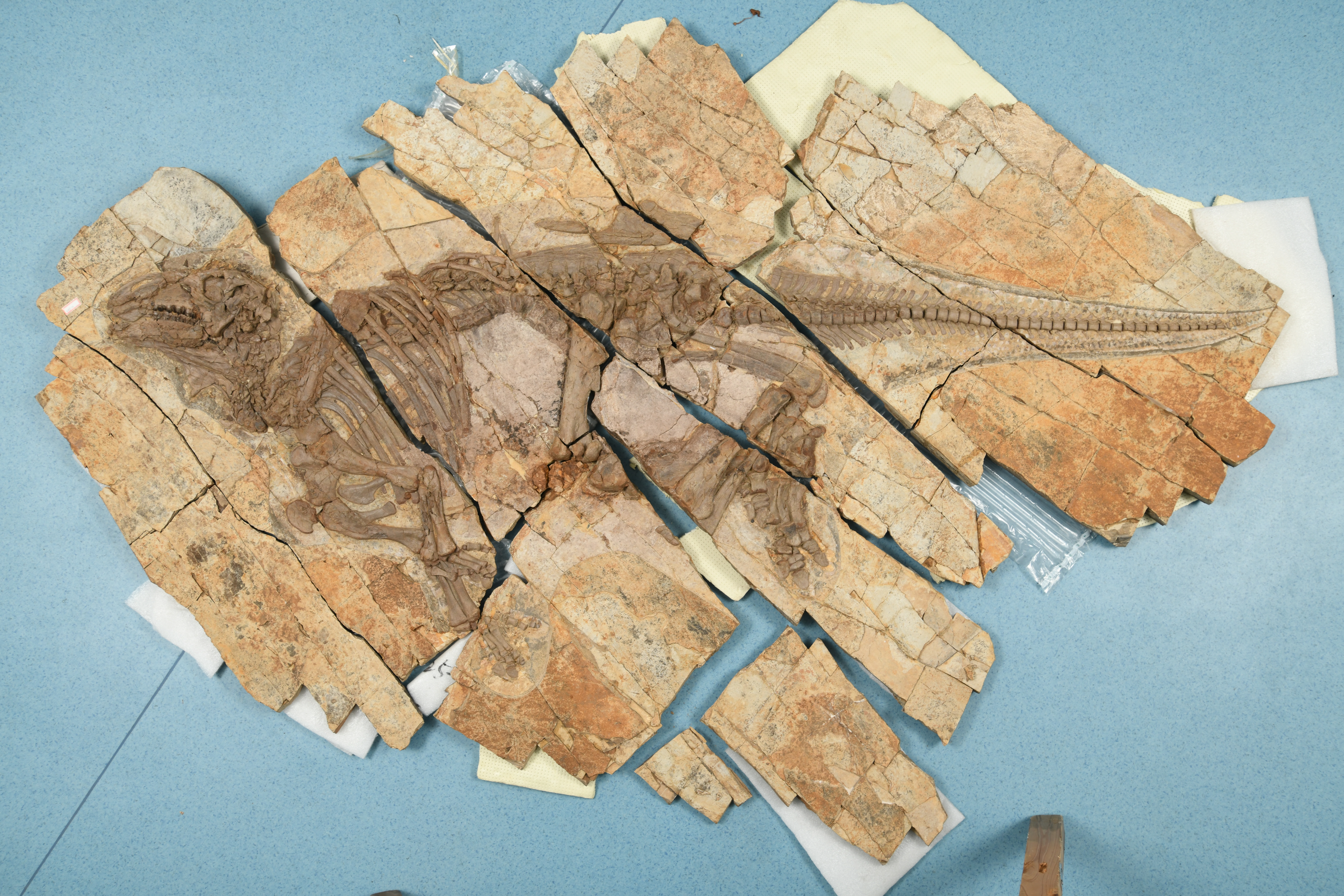 黄建东介绍,化石标本为一幼年个体骨架,来源于热河生物群这一世界级化石宝库,现收藏于安徽省地质博物馆, 尽管全长仅2.45米且处于生长期,其骨骼与皮肤组织保存近乎完整。
