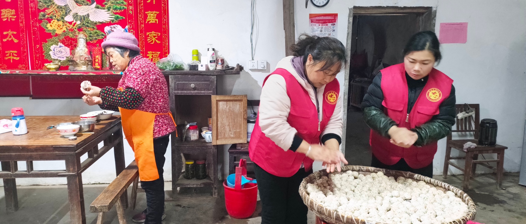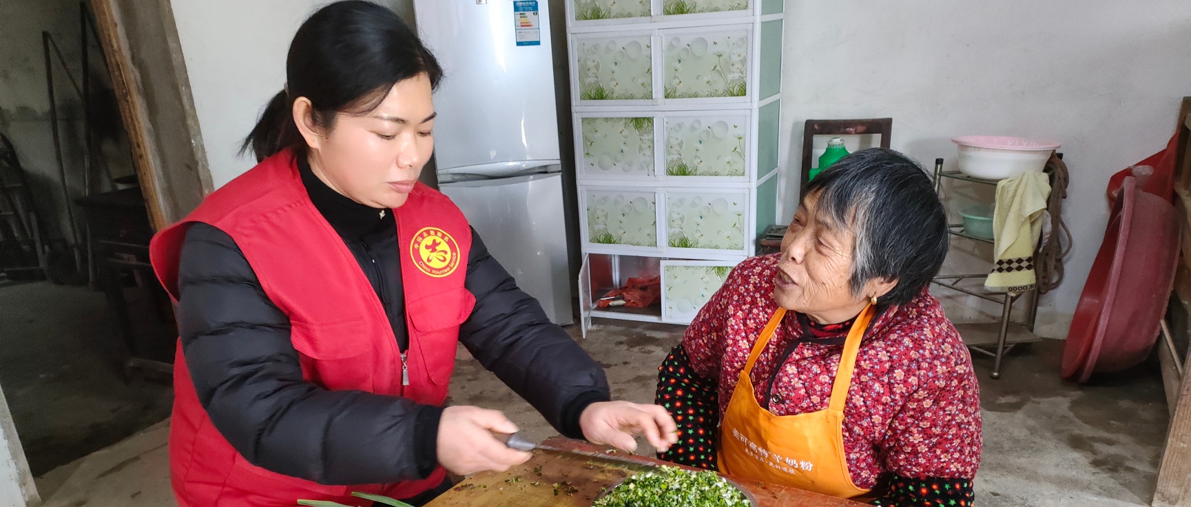 日前,在合肥市肥东县马湖乡三官社区72岁独居老人吴齐莲家中,两位身穿红色马甲的社区老幼专干刘从英和社区志愿者张世霞,正在帮助老人炸过年吃的圆子,一老一少的对话,让一旁的张世霞感受着浓浓的亲情氛围,禁不住夸赞道:“刘主任心细,她让我来帮忙,我也非常乐意做志愿服务。”