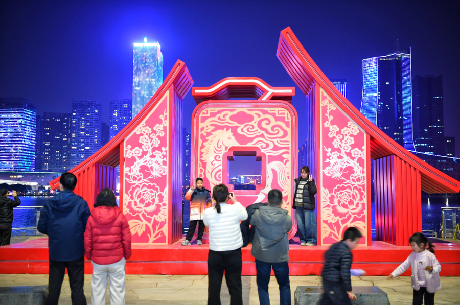 “快帮我拍一张,要把后面的‘合’字和灯光秀一起拍进去!”大年初一晚上,天鹅湖畔流光溢彩,市民张女士招呼着家人,在市民广场中央的“合”字艺术装置前排队留影。这个曾在央视春晚合肥分会场开场亮相的精美舞台,如今成为蜀山最火的打卡点。