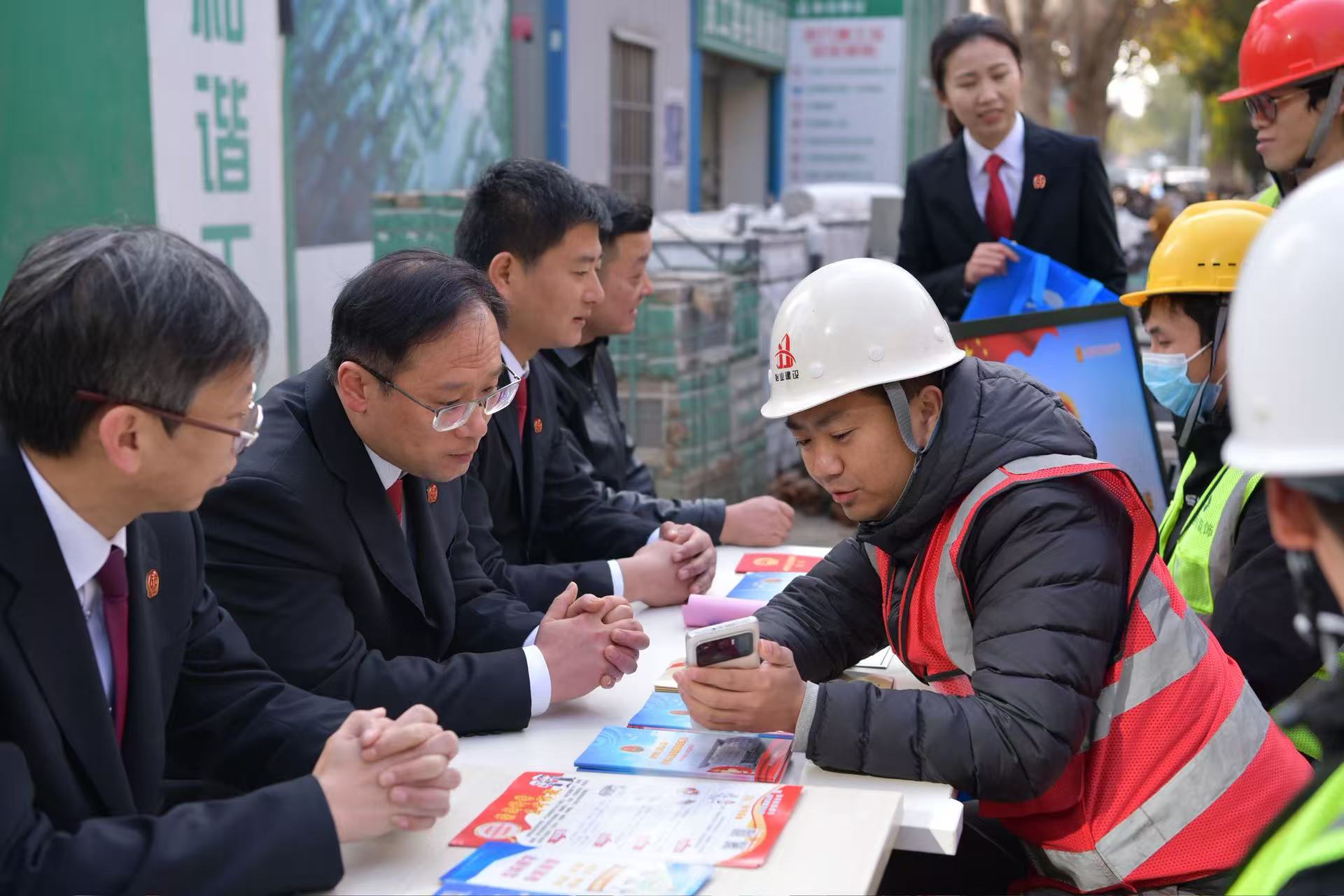 近日,合肥铁路运输法院联合合肥市常青街道淝南社区开展普法活动,将一堂生动而实用的宪法课堂搬进了辖区内的建筑工地。法官们结合工友们最关心的工资支付、劳动合同、工伤维权等实际问题,深入浅出地解读宪法法律中的相关条款。