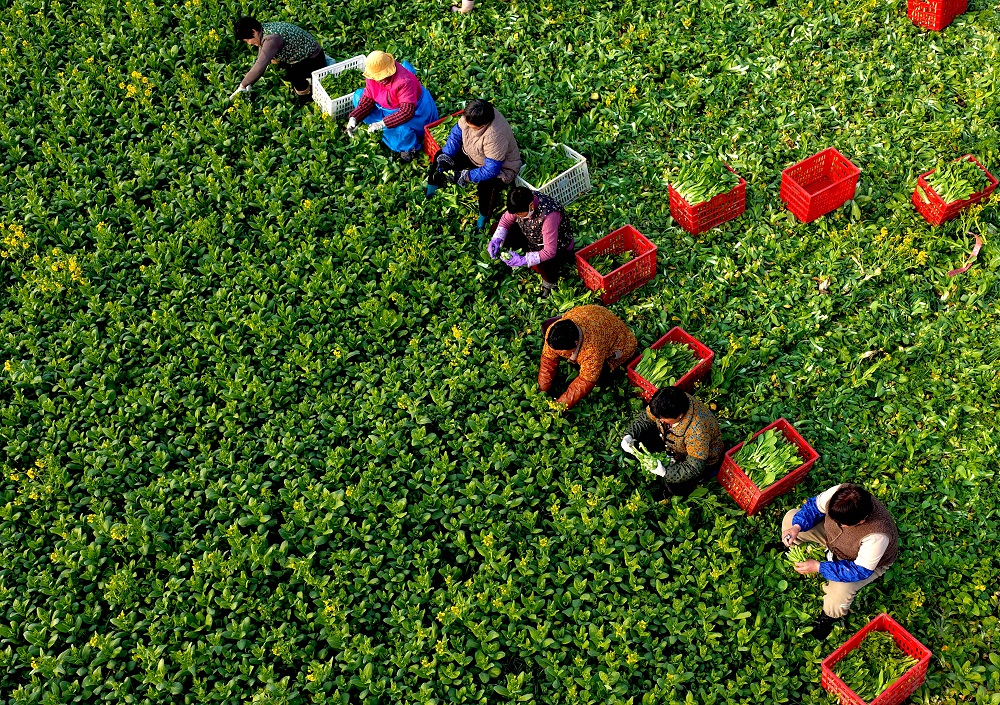 3月9日,在亳州市利辛县汝集镇刘店村蔬菜种植基地,农民在采收菜薹。