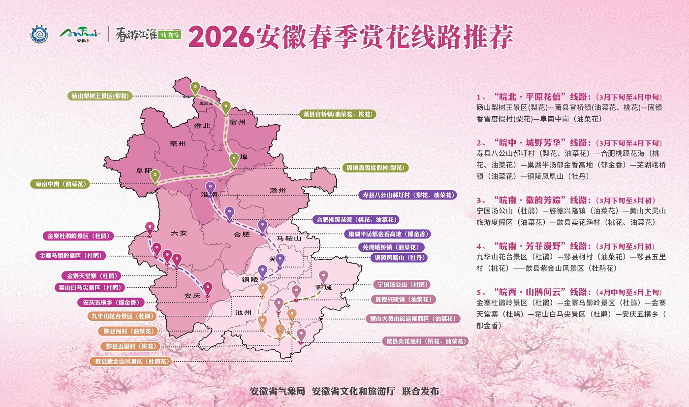 当三月的微风迎面吹来,漫天遍野的花儿正竞相开放,把春天装扮得格外美丽。3月20日,安徽省气象局与省文化和旅游厅联合发布2026安徽春季赏花线路,精心推出5条覆盖皖北、皖中、皖南、皖西的精品赏花路线,串联起全省近30个赏花胜地,花期从3月下旬持续至5月上旬,满足不同时段的出游需求。