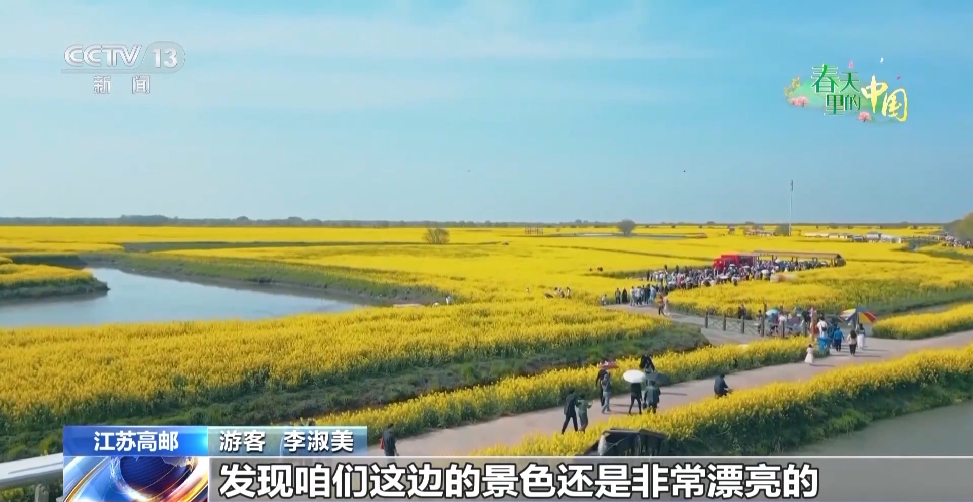 在高邮湖畔一望无际的湖滩上,千亩油菜花竞相绽放、一朵朵金黄的油菜花簇拥成海,与烟波浩渺的高邮湖无缝衔接,微风轻拂,金色花田泛起层层涟漪,清新的花香随风飘散,沁人心脾。摄影爱好者来这里捕捉春日美景,游客则三五相约休闲踏青。