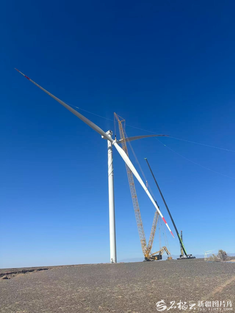 3月22日,其亚新疆集团有限公司在木垒哈萨克自治县大石头乡吊装风机。王海滨 摄