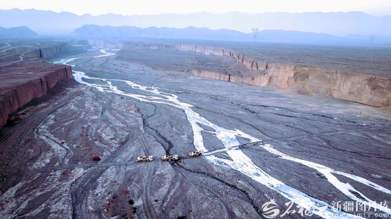 高精度可控震源车在山前戈壁施工作业。王健 摄