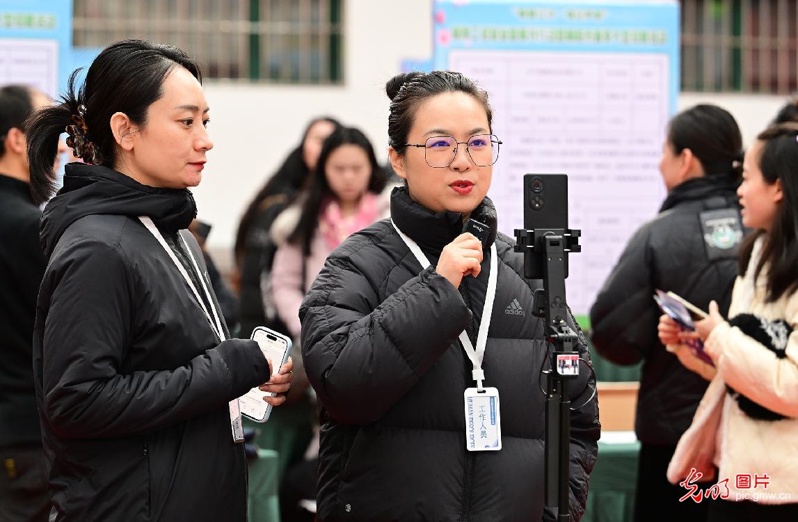 日前,辽宁省朝阳市“春暖辽沈强企护航”行动暨朝阳市春季大型招聘活动在朝阳师范学院启幕。78家参会企业提供优质岗位1703个,吸引高校毕业生、就业困难人员等众多求职者进场咨询洽谈。活动旨在通过稳就业、保用工、优服务等方式助力当地经济高质量发展。活动同步开启直播带岗,线上线下联动服务求职者,掀起“云端”求职热潮。图为工作人员在直播带岗。(仇一军摄/光明图片)