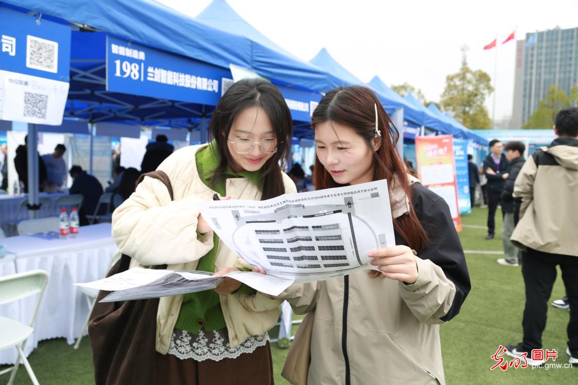 日前,江苏省镇江市江苏大学举办2026届毕业生春季首场校园综合性供需洽谈会,来自省内外的355家用人单位进场,为2026届毕业生提供逾7500个就业岗位。招聘会还设置政策解读、简历指导、反诈防骗等现场服务区,全方位助力2026届毕业生充分就业。图为毕业生在招聘会上求职。(杨雨摄/光明图片)