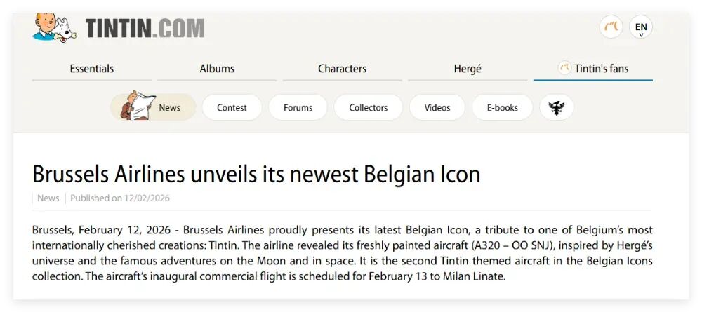 今年2月,《丁丁历险记》官网发布的一则关于比利时航空公司选择将丁丁作为其客机的涂装时,亦曾写道丁丁是比利时的标志,而且是“比利时在国际上最受喜爱的文艺创作”。