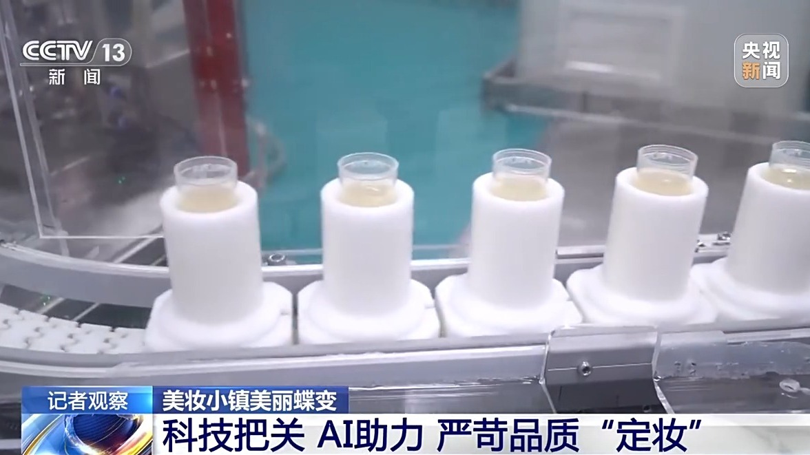 比生产速度更关键的是产品质量。车间内,刚灌装完成的护肤精华,正通过在线视觉检测设备进行严格检测。