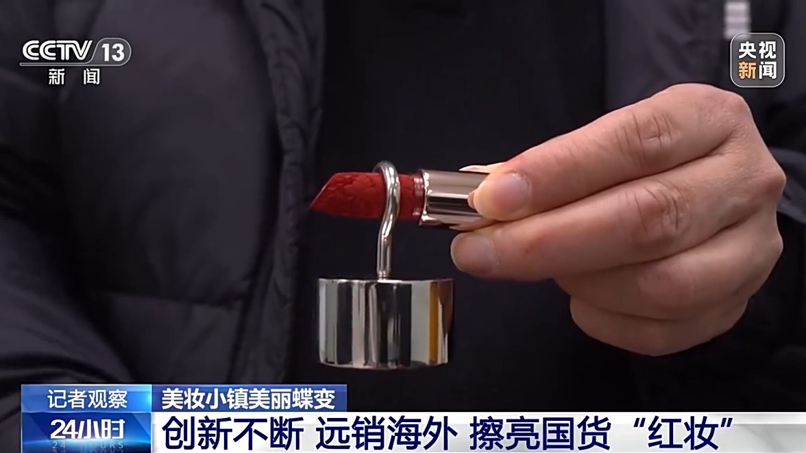 在小镇另一家企业,一支口红的变化,更能体现国货的技术突破。过去,想要生产带有精美浮雕的口红膏体,只能高价进口硅胶模具,每套价格40元,下单后还需等待三四个月,难以跟上市场节奏。企业下定决心自主研发,仅模具配方就试验近500次,耗时两年。如今,企业自主生产的硅胶模具,使用寿命与进口产品相当,成本降至10元以内。外观精美的浮雕口红,承重力也十分出色,悬挂200克砝码也不会断裂。