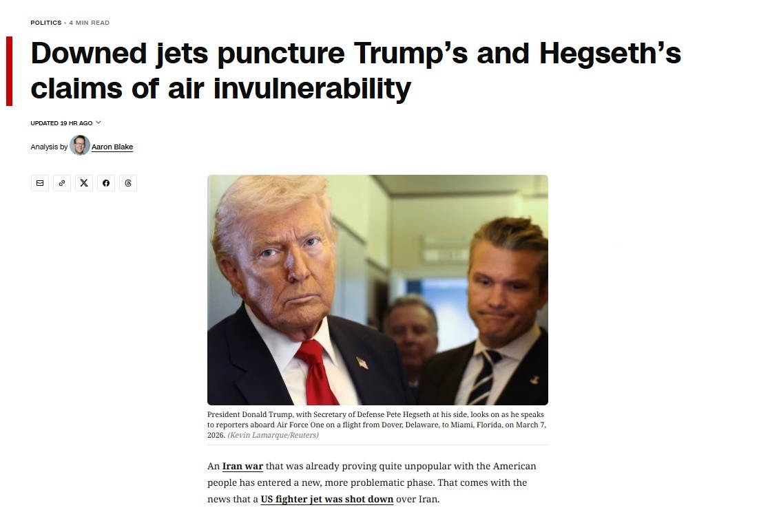 文章称,美国总统特朗普与国防部长赫格塞思此前曾表示,美国和以色列在伊朗上空拥有近乎不受限制的飞行自由。他们声称,伊朗方面根本不具备反制能力。