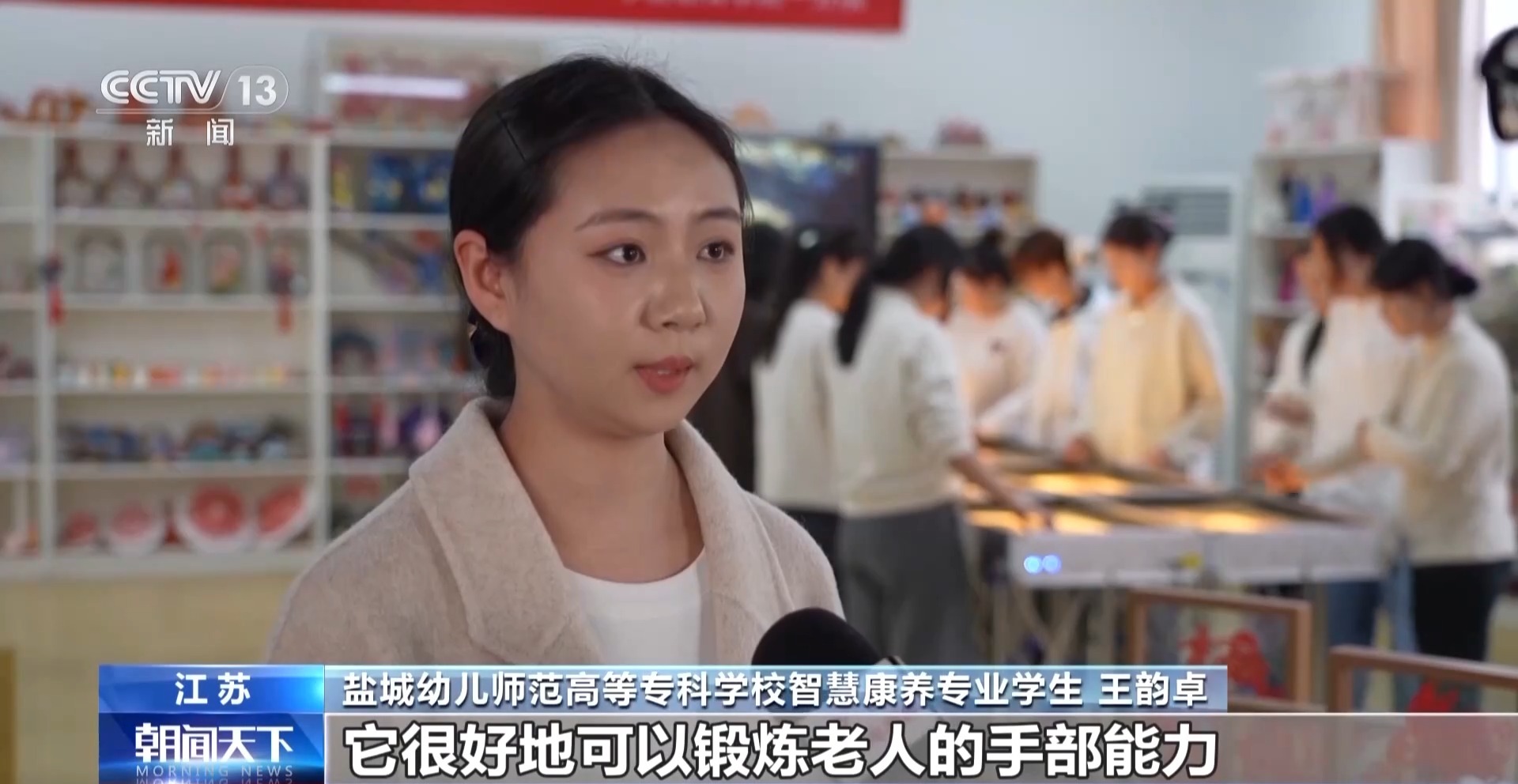 盐城幼儿师范高等专科学校智慧康养专业学生王韵卓:它可以很好地锻炼老人的手部能力,还可以放松心情,是康养服务的创新手段。
