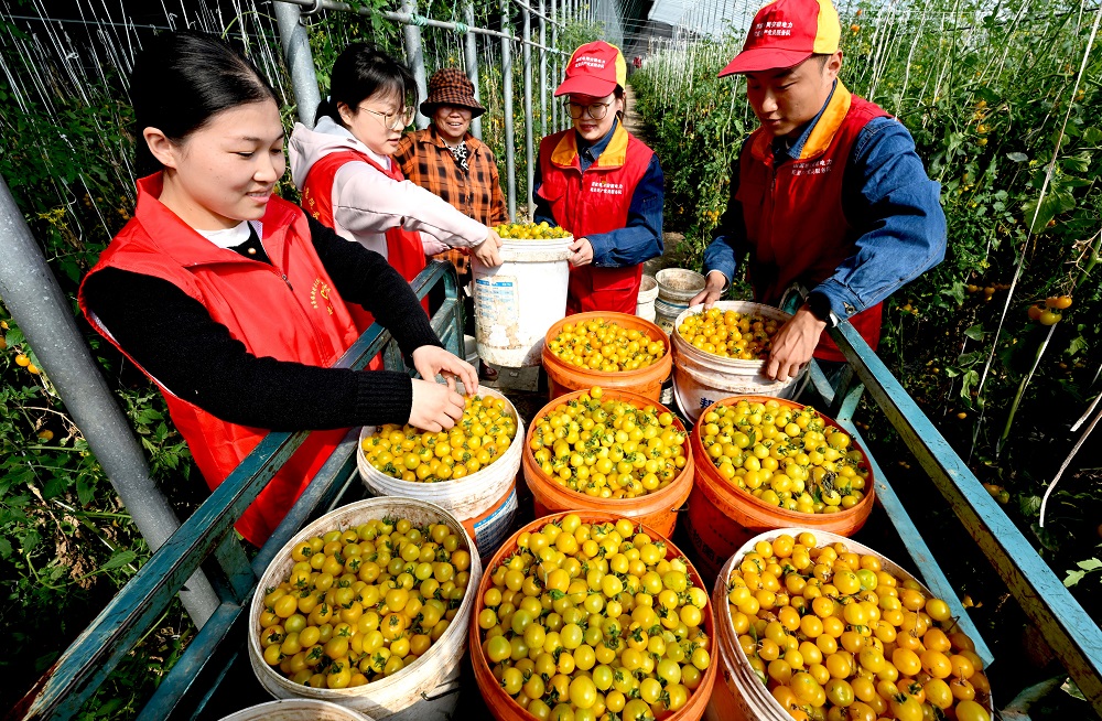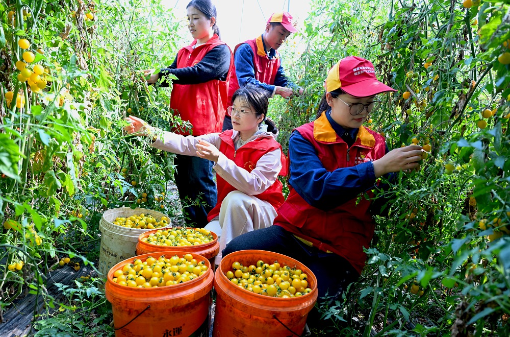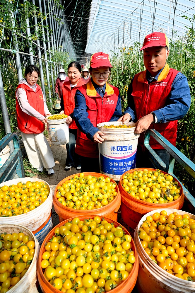 4月7日,在亳州市利辛县汝集镇青优雾耕现代产业园,党员志愿者和镇青年干部一起在帮助菜农采收水果番茄,供应市场。
