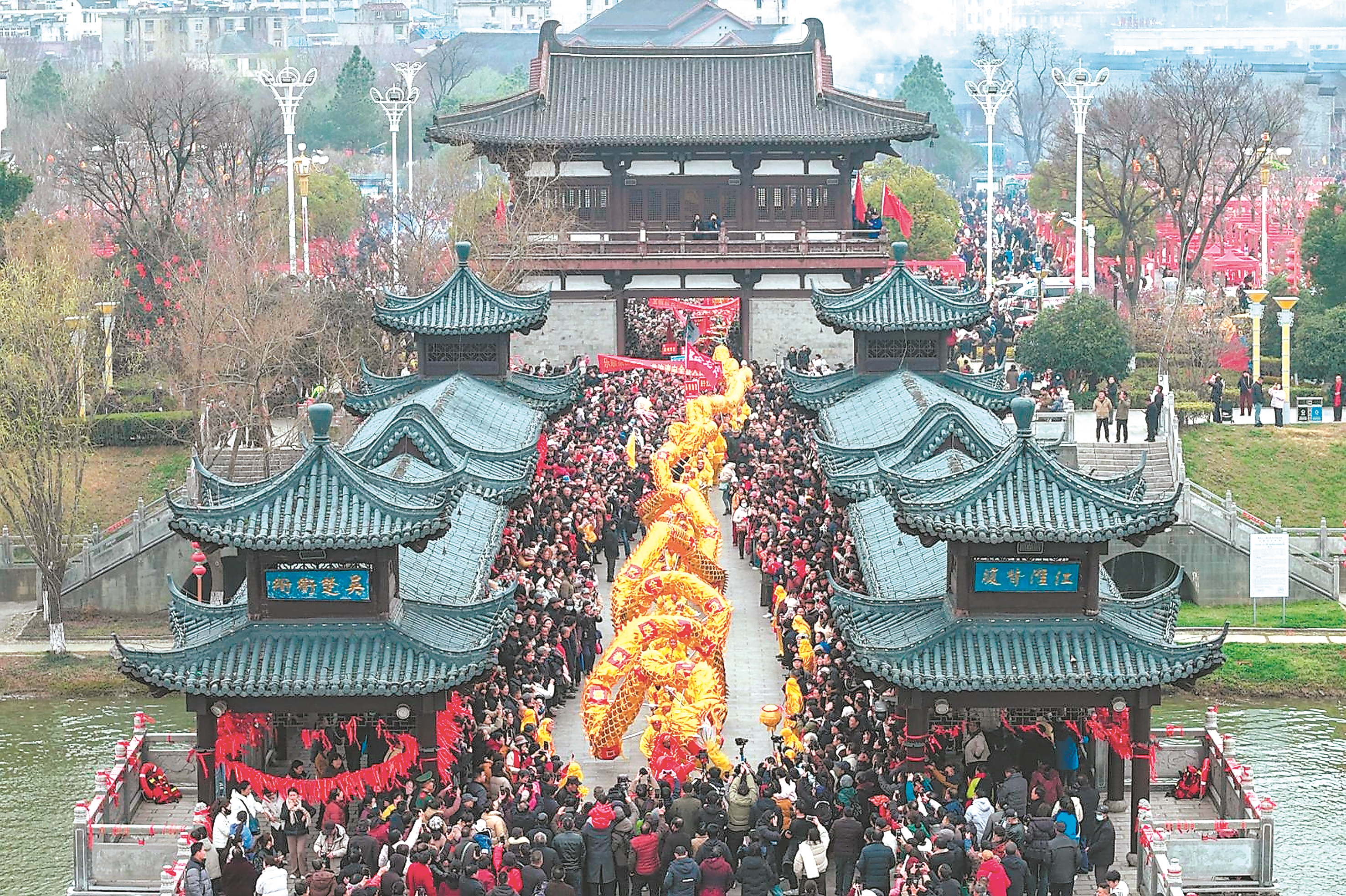 始于东汉的“走太平”,传承近两千年长盛不衰,2006年入选安徽省首批省级非物质文化遗产名录。每年正月十六,全椒全城万人空巷,扶老携幼踏桥祈福,场面盛大壮观。这场演出以“走太平”为脉络,将皖东大地两千年的风雨、温情与守望娓娓道来。