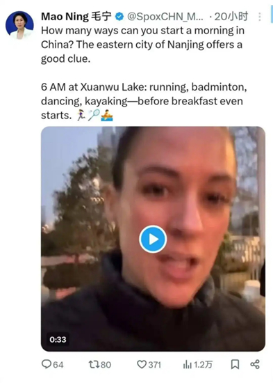 外交部发言人毛宁在海外社交媒体平台转发卡斯拍摄的晨练视频
