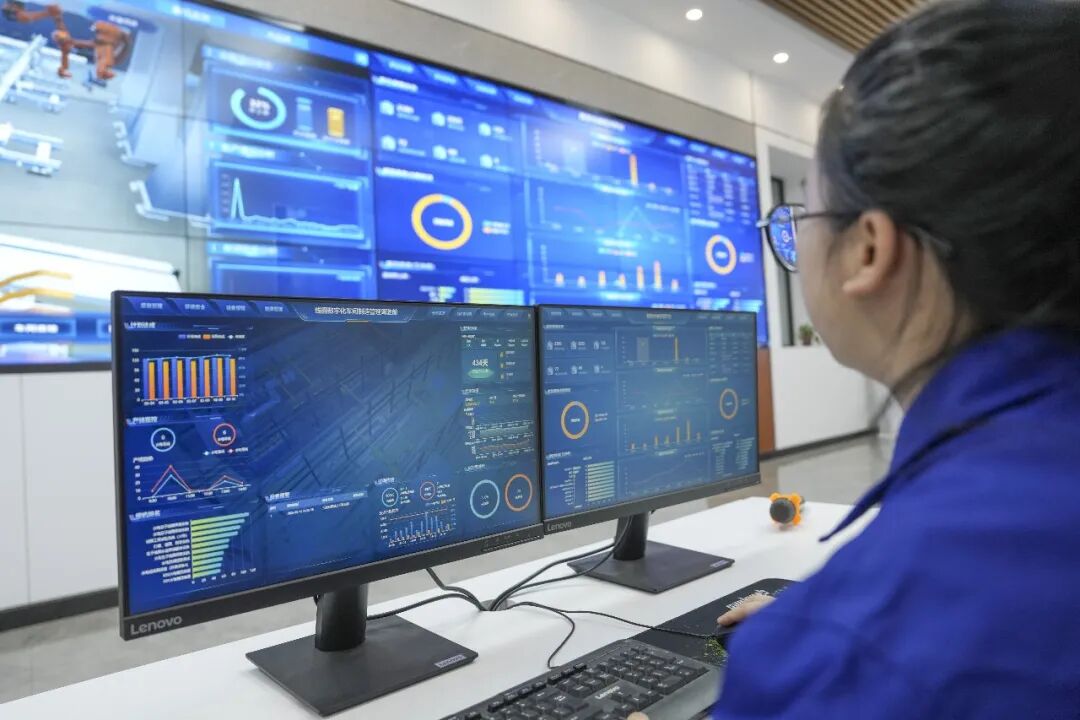 技术人员在数字化车间集控中心监视生产系统运行数据。新华社记者 王松 摄