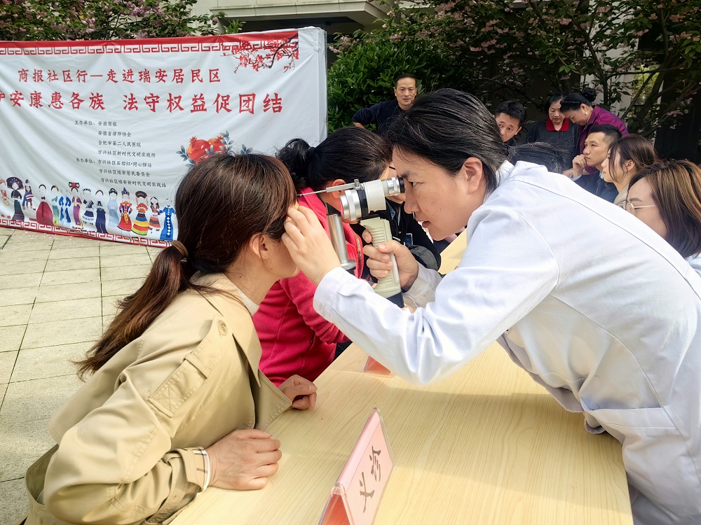 “医生,我右眼看东西总是模糊,滴了眼药水也不见好。”得知家门口有三甲医院的专家来义诊,今年58岁的居民沈阿姨提前来到现场。合肥市第二人民医院眼科副主任医师王慧用便携式裂隙灯为她检查后,发现她眼睛里长了息肉,并且已经蔓延至眼球。王慧建议沈阿姨尽快手术。“医生,每年夏天我的眼睛又红又痒,总是觉得眼前有小飞虫飞来飞去。”居民赵奶奶也被眼睛问题困扰,王慧诊断老人已患有白内障。