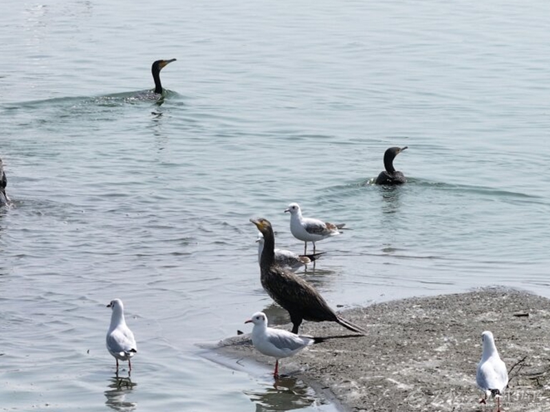 白鹭、鸬鹚、野鸭等水鸟在艾西曼湖边嬉水。□麦吾兰江·莫明摄