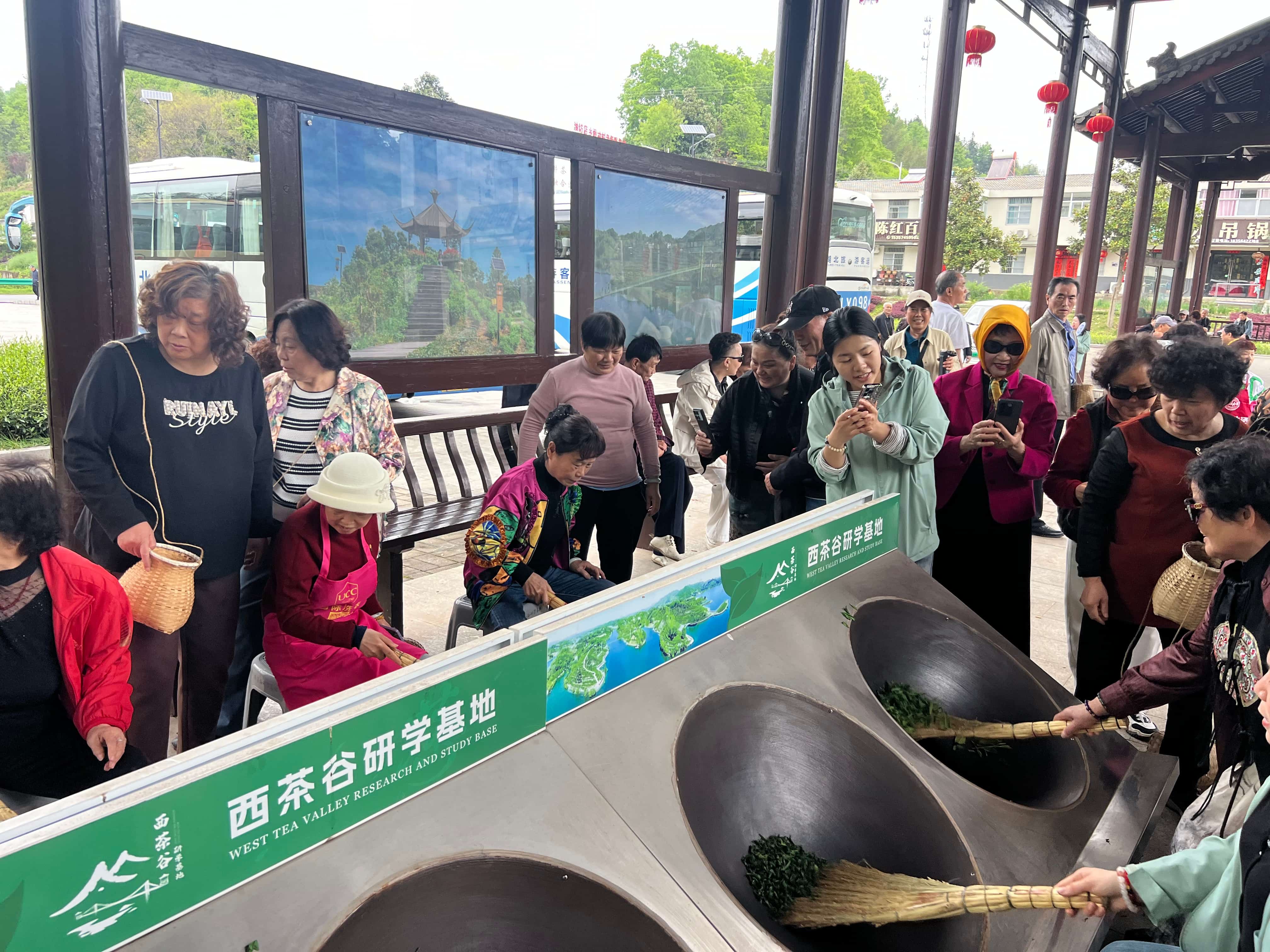 4月14日下午,在位于六安市金寨县油坊店乡面冲村的西茶谷面冲茶叶主题公园,来自武汉的孙先生兴冲冲地把自己刚在茶园采下的茶叶鲜叶放进茶锅,在工作人员的帮助下体验六安瓜片制作技艺中的“杀青”。“我们一共4辆大巴车从武汉过来,第一次来金寨,环境好,体验也非常好。”