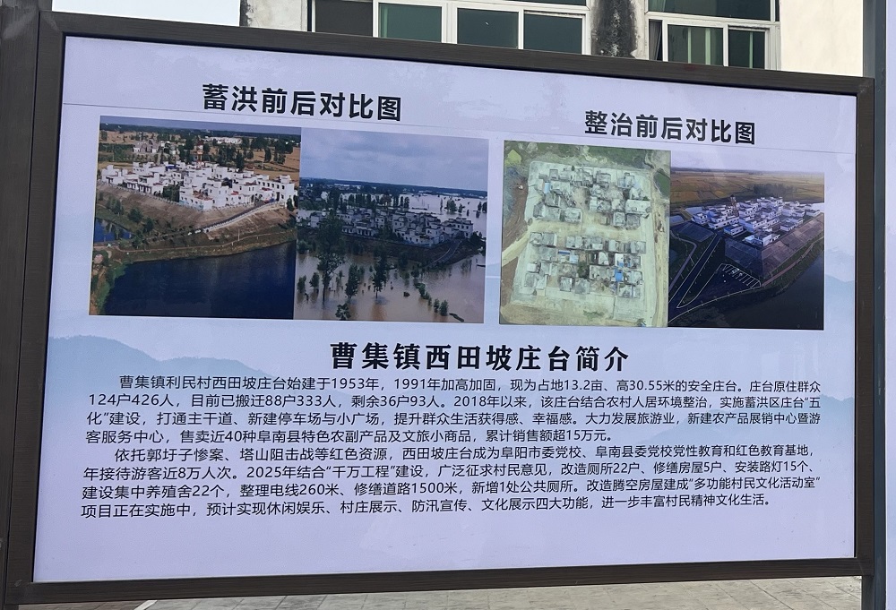 2018年以来,阜南县开展庄台整治,实施居民迁建。整治过程中,通过实施庄台净化、硬化、亮化、绿化、美化“五化”建设,打通庄台主干道,铺设污水网,新建公园、停车场、小广场等,庄台人居环境显著改善,群众幸福感不断增强。2020年8月以来,累计接符参观人员约20万余人次。如今的西田坡绿树成荫,房前屋后种上了小菜园,村容村貌焕然一新。来的游客多了,近年来西田坡还大力发展旅游业,建起了农产品展销中心暨游客接待中心,销售近40中阜南特色农副产品及文旅小商品,累计销售额超15万元。