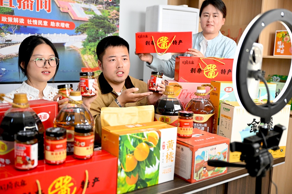 4月19日,在亳州市利辛县永兴镇诸王社区,青年干部和村民一起正通过“和美乡村直播间”推介当地特色农产品。