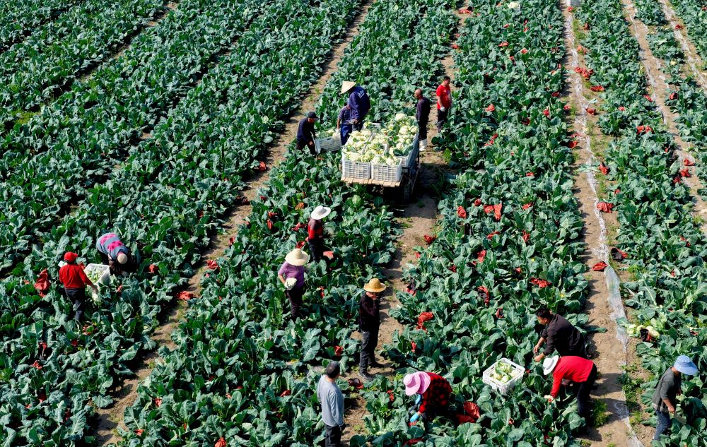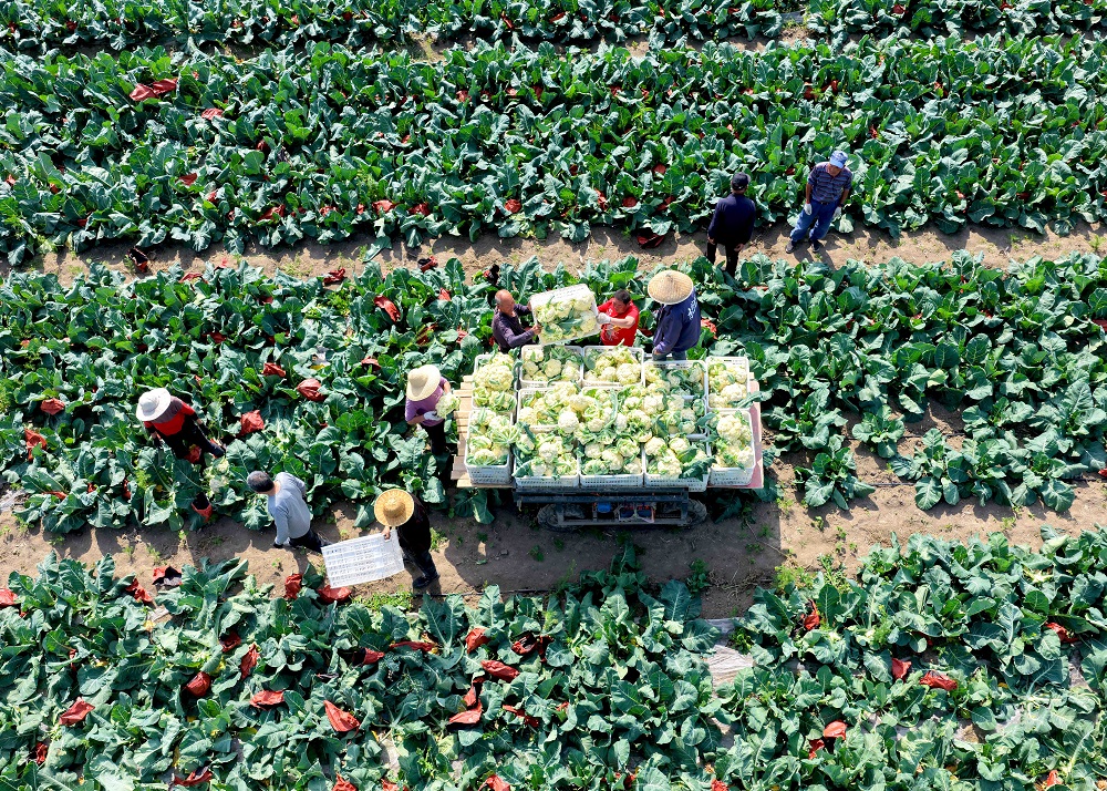 4月19日,在亳州市利辛县旧城镇陆暗楼村蔬菜种植基地,村民在采收有机花菜供应市场。