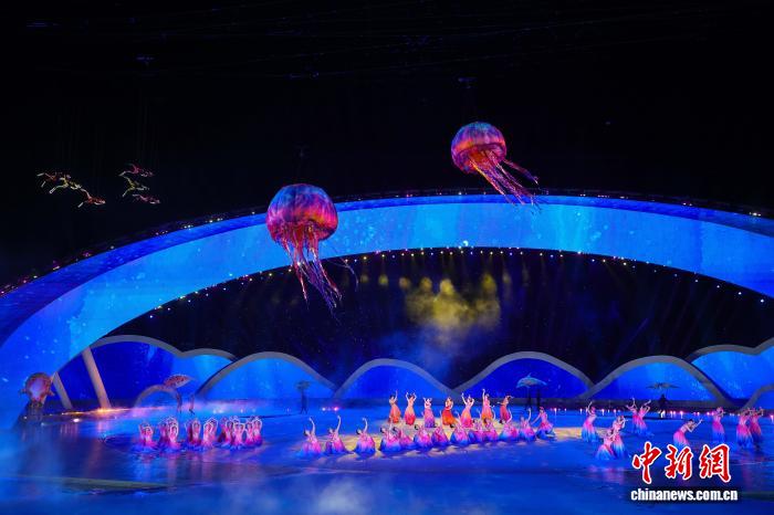 4月22日晚, 第六届亚洲沙滩运动会开幕式在三亚亚沙公园举行。 图为开幕式上的海洋元素文艺表演, 充气水母“游”进演出现场。(第六届亚洲沙滩运动会组委会 供图)