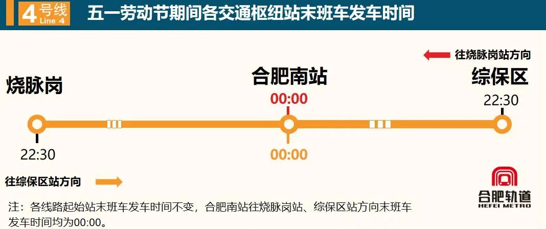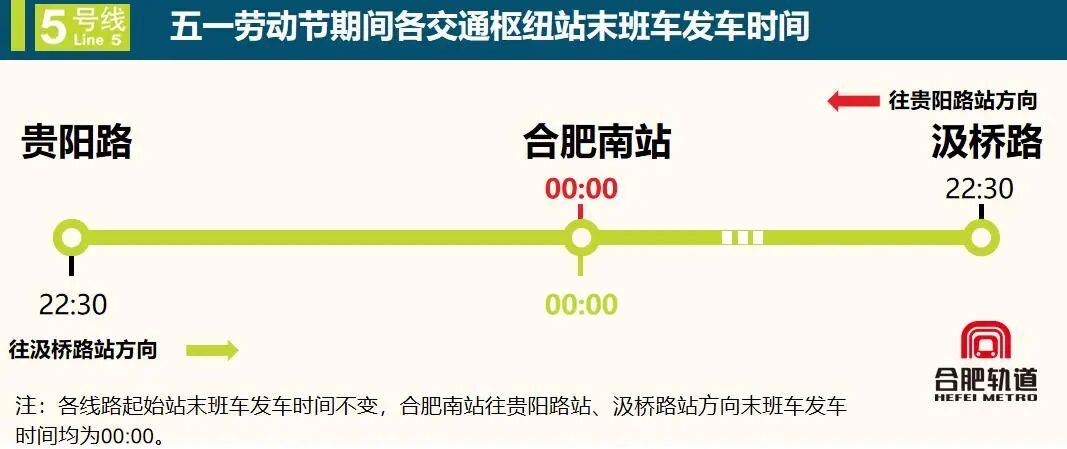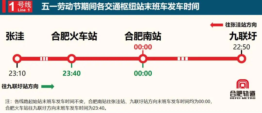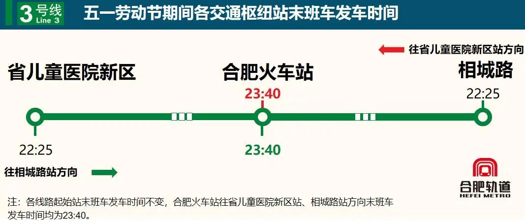 假期期间,合肥轨道全线网执行日常周五及双休日末班车安排,重点交通枢纽站末班车将延时运营,确保国铁夜间到达旅客顺利接驳。其中,1号线合肥南站开往张洼站、九联圩站方向末班车均延至次日00:00;合肥火车站开往九联圩站方向末班车延至23:40。3号线合肥火车站开往省儿童医院新区站、相城路站方向末班车均延至23:40。4号线合肥南站开往烧脉岗站、综保区站方向末班车均延至次日00:00。5号线合肥南站开往贵阳路站、汲桥路站方向末班车均延至次日00:00。5月9日补班当天,各线路执行周五工作日运营时间。