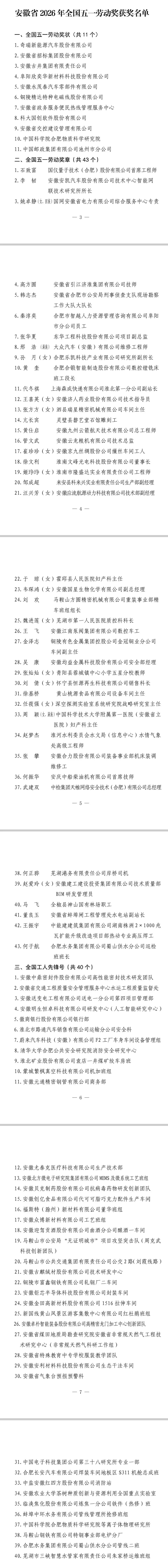 据悉,安徽共有奇瑞新能源汽车股份有限公司等11个集体获得全国五一劳动奖状荣誉,国仪量子技术(合肥)股份有限公司首席工程师石致富等43名个人获全国五一劳动奖章荣誉,安徽中鼎密封件股份有限公司高性能密封技术研发团队等40个集体获全国工人先锋号荣誉。(安徽商报记者 吴梦君)