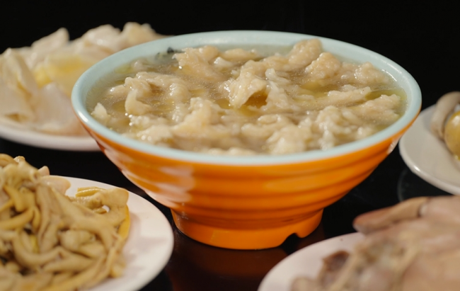 故事要从1920年讲起。第一代创始人胡翰臣,凭借一手传统手艺,将鸡肉裹上秘制红薯淀粉,反复捶打,做成筋道弹牙的粉鸡,再配上慢火熬煮的土鸡高汤。一碗下肚,暖透五脏。如今,第四代传承人刘垒依旧守着古法,不肯走半点捷径: “从选材到剔骨、上浆、汆水、吊汤、装碗,每一步都不能马虎。轻摔慢打三百下,小火慢熬九小时,才能成就一碗真正有灵魂的粉鸡。”