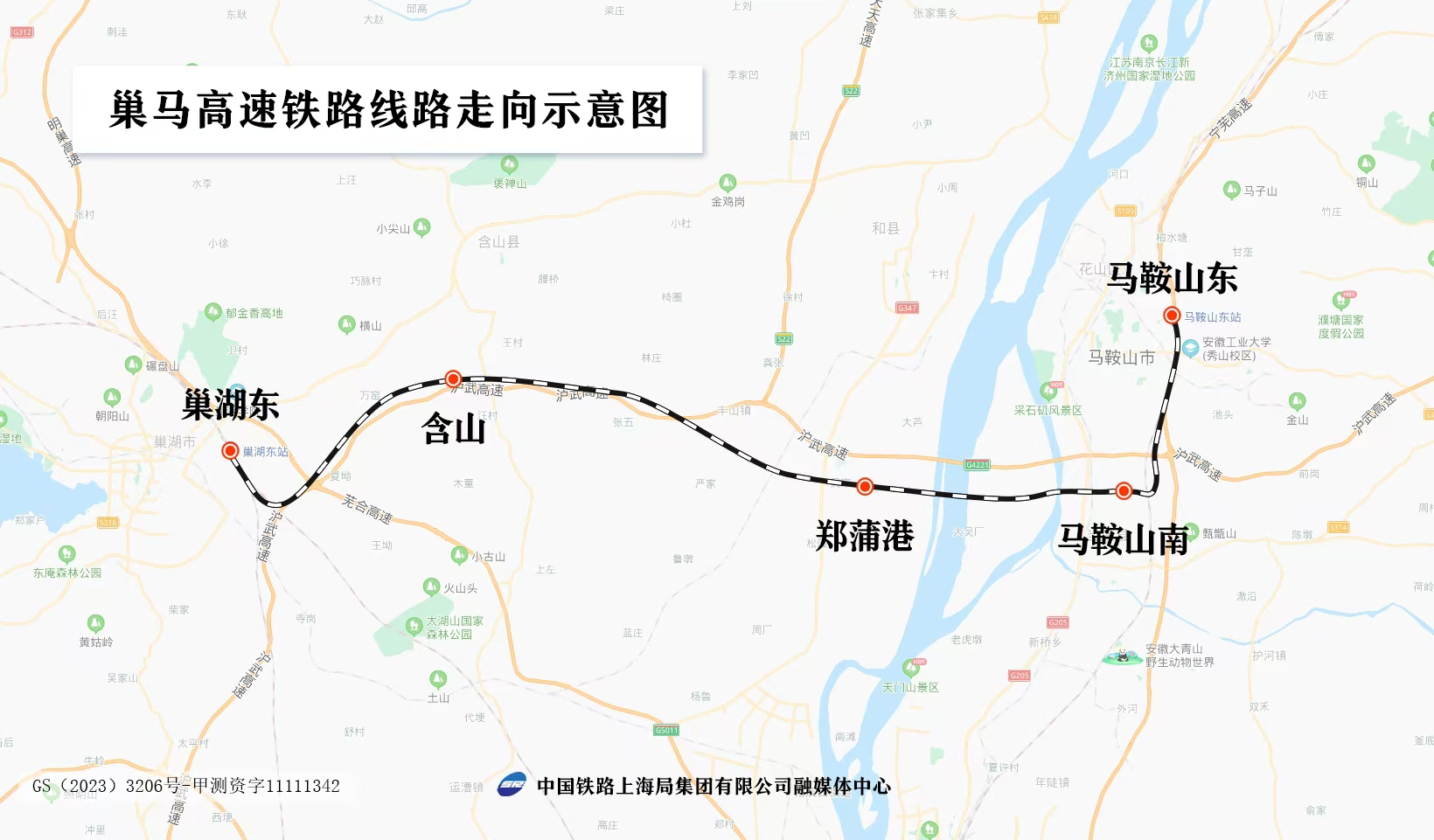 据介绍,巢马高铁起于巢湖东站,向东经含山县、和县、郑蒲港新区、当涂县、经开区、雨山区、花山区后,引入马鞍山东站,正线全长61公里,设计时速350公里。沿线设巢湖东、含山、郑蒲港、马鞍山南、马鞍山东5座车站,其中巢湖东、马鞍山东为既有车站,其余为新建车站。巢马高铁在巢湖东站连接合杭高铁,在马鞍山东站连接宁安高铁,是马鞍山与安徽省会合肥的直接连接线。该控制性工程——马鞍山长江公铁大桥位于既有常合高速马鞍山长江公路大桥上游约2.3公里处,连接马鞍山市和县和当涂县,总长9.8公里,由和县侧引桥、主汊航道桥、江心洲引桥、副汊航道桥、当涂侧引桥组成;桥梁上层为设计时速80公里的双向六车道城市快速公路,下层为设计时速250公里的双线高速铁路和设计时速200公里的双线预留城际铁路。其中,主汊航道桥为双主跨1120米、总长3248米的三塔钢桁梁斜拉桥,是世界首座双主跨超千米的三塔斜拉桥,一举创下6项世界纪录;副汊航道桥为主跨392米的无砟轨道钢桁梁斜拉桥,是目前已建成的世界最大跨度的三索面钢桁梁无砟轨道斜拉桥。