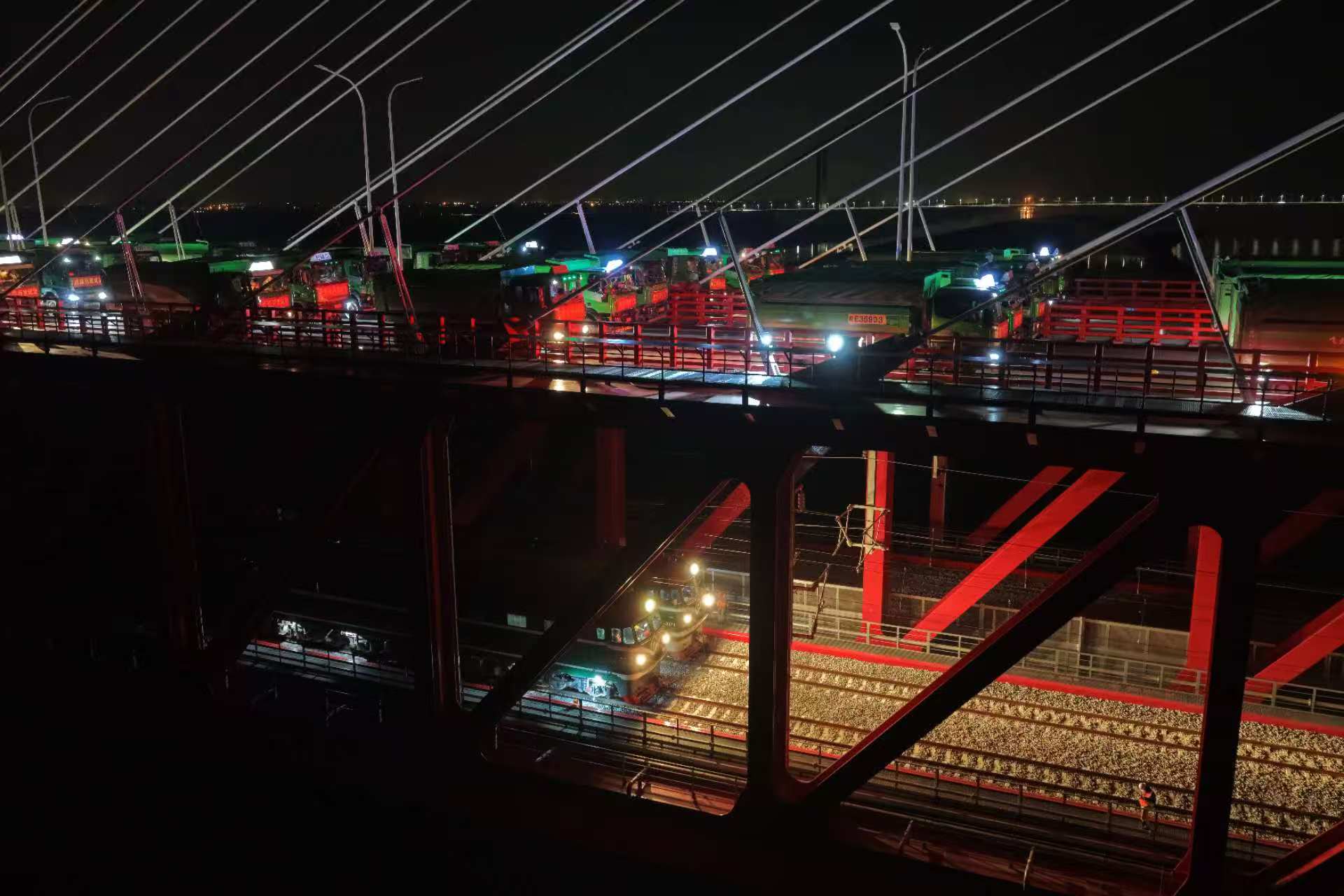 据悉,试验团队在主汊航道桥和副汊航道桥分别布设了524个和337个测点,对大桥整体刚度、主梁应力、索力、支座位移等9项关键结构指标进行系统验证。最大对称静力加载工况堪称超级“压力试验”。“公路桥面共动用108辆满载50吨的三轴加载车、铁路桥面动用18辆货物加载车,加载总重约7000吨,相当于3800多辆家用运动型多功能车(SUV)同时压在桥上。”该负责人告诉记者,面对主汊航道桥两主跨和中塔空间四塔肢的复杂结构,以及世界最长铁路桥梁斜拉索(650米)的测试难题,试验团队创新性提出多种方案,最终完成试验。